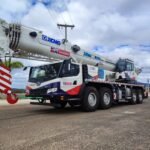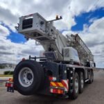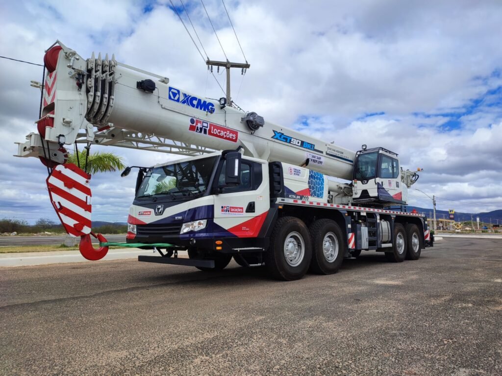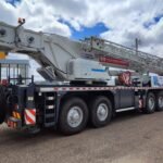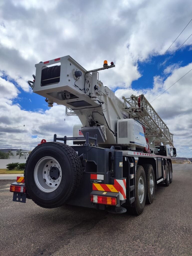 lança principal de cinco seções 49m, Jib 10,5m/17,5m, mecanismos de içamento principal e auxiliar, Moitões de 55t, 35t, e 5,5t, contrapeso 11t.